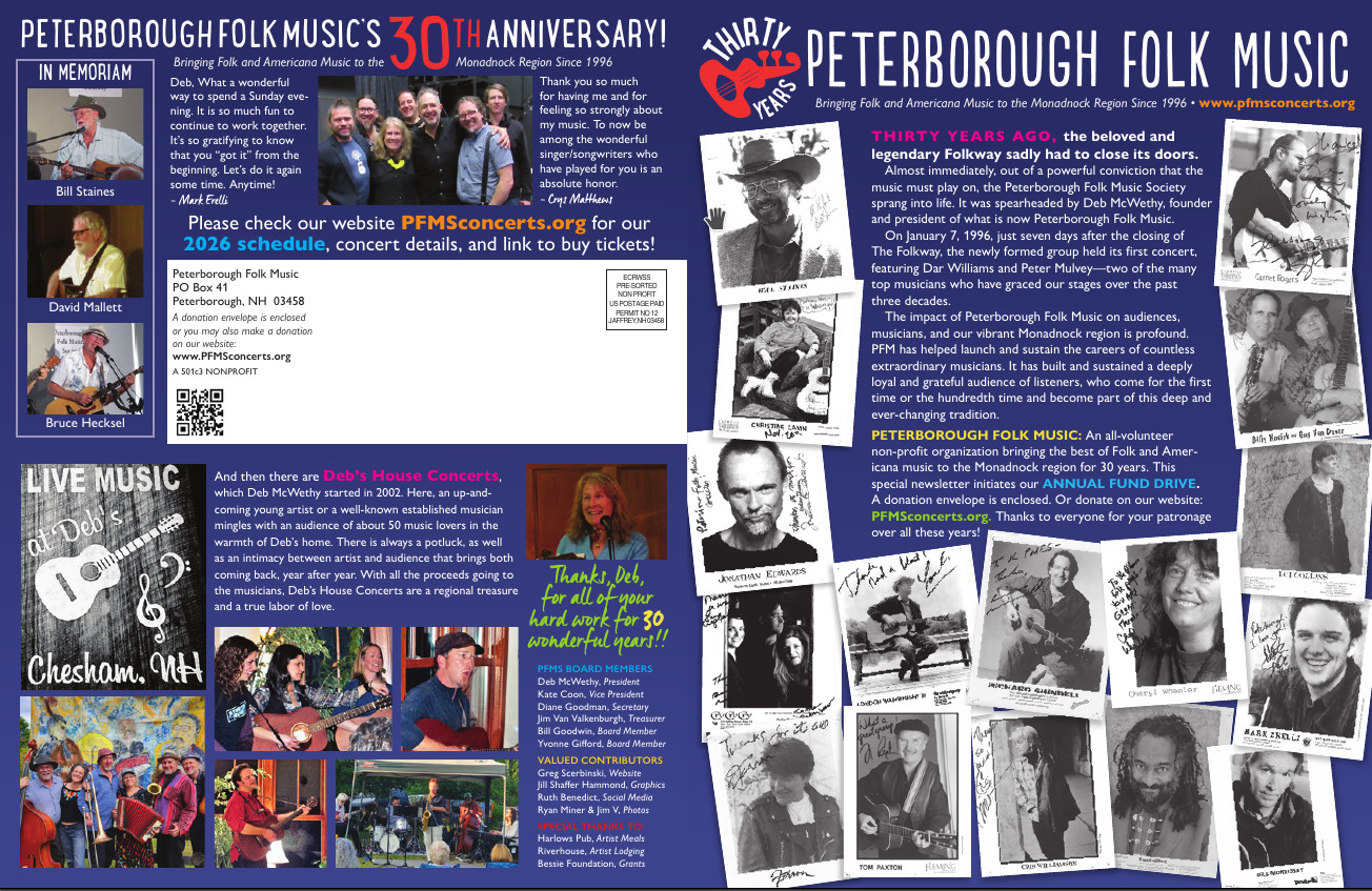 The dedication of the PFM Board and volunteers is a reminder of the heart it takes to bring old favorites and soon to be new favorite artists to our communities. Folk music is community. Folk Music isn’t a place. It’s a feeling. It’s connectedness in times when things may seem fragmented. We are gifted with music that feeds our spirit from Peterborough Folk Music whether at the Park Theater in Jaffrey, Bass Hall in Peterborough or at Deb’s Place in Chesham.